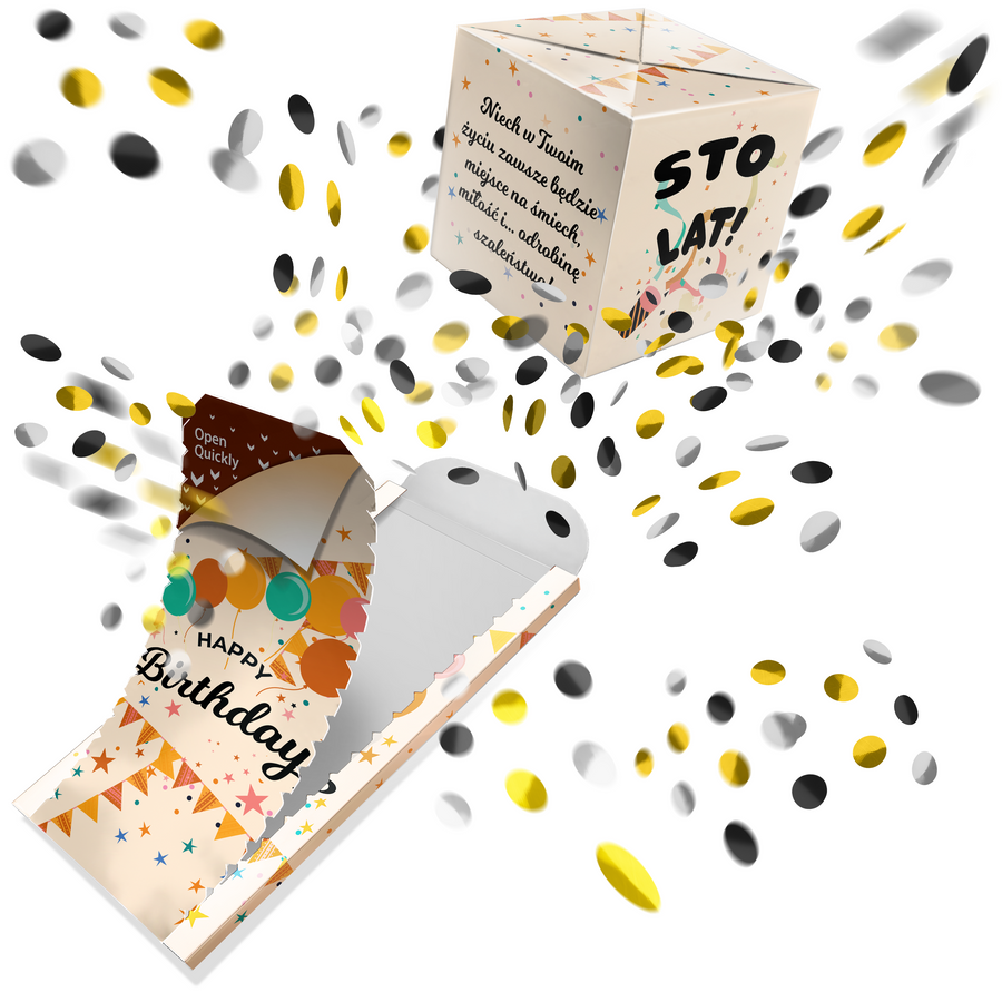 Po otwarciu tej magicznej kartki, zostaniesz dosłownie zatopiony w fali radosnego konfetti, co sprawi, że chwila ta stanie się jeszcze bardziej niezapomniana. Wybuchająca kartka urodzinowa eksplodując, wyrzuci sześcian wraz z kolorowym konfetti. Efekt zaskoczenia gwarantowany!