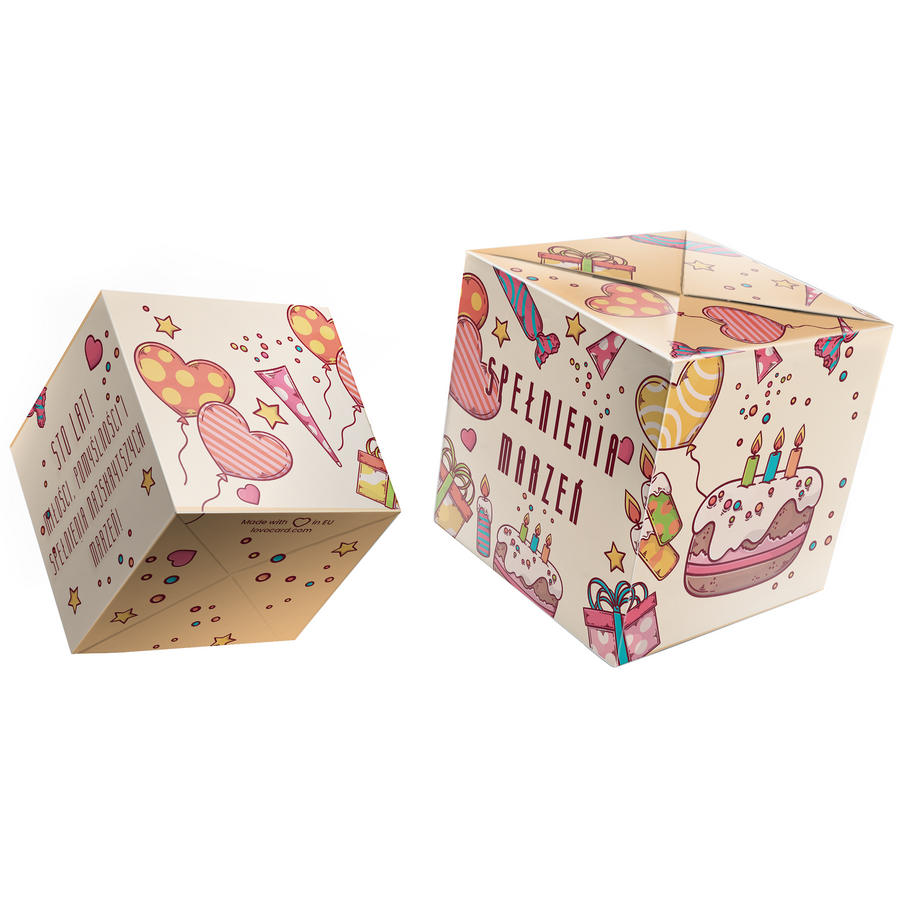 Po otwarciu tej magicznej kartki, zostaniesz dosłownie zatopiony w fali radosnego konfetti, co sprawi, że chwila ta stanie się jeszcze bardziej niezapomniana. Wybuchająca kartka urodzinowa eksplodując, wyrzuci sześcian wraz z kolorowym konfetti. Efekt zaskoczenia gwarantowany!