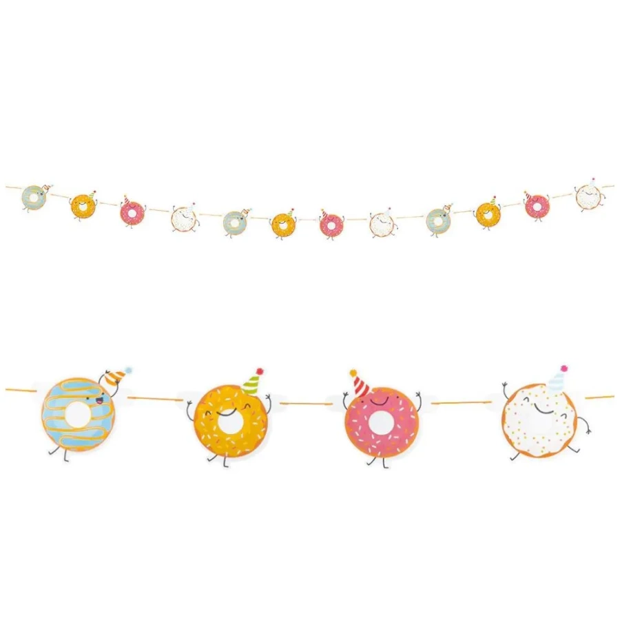 Girlanda urodzinowa element girlandy przedstawia uroczy donut lub pączek w różnorodnych kształtach i kolorach. Soczyste odcienie różu, żółtego i niebieskiego tworzą kolorową paletę, która dodaje słodkiego uroku i radości do każdego pomieszczenia. Każdy donut ozdobiony jest czapeczką i kolorową posypką nadając im wesołego charakteru.