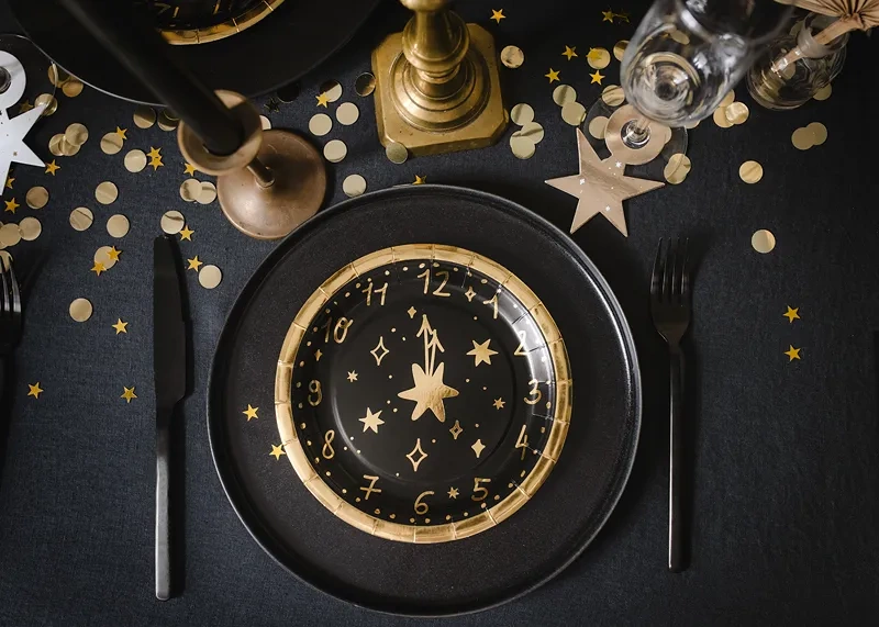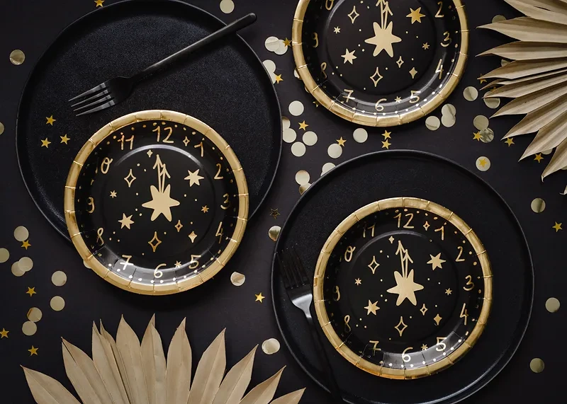 Zegar na talerzykach przedstawia symboliczny odliczający czas, tworząc atmosferę radosnego oczekiwania na północną noc. Wyjątkowy i elegancki wzór z pewnością zachwyci uczestników przyjęcia.