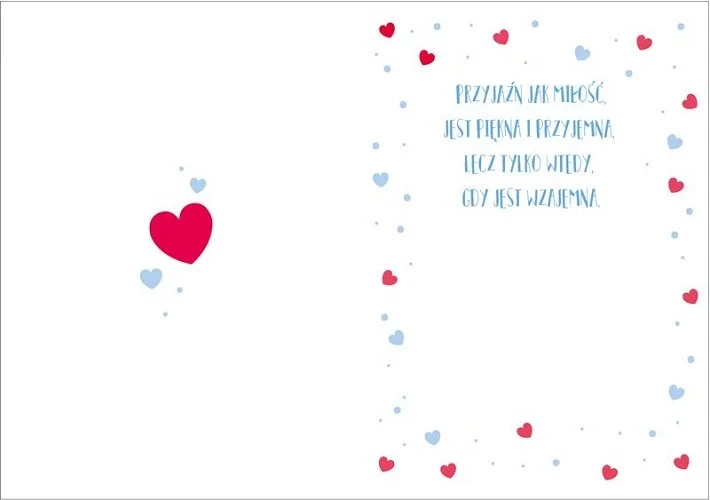 W środku tekst: "Przyjaźń jak miłość, jest piękna i przyjemna lecz tylko wtedy gdy jest wzajemna" oraz miejsce na własną dedykację i podpis.