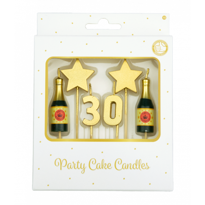 - Zestaw składa się z 6 sztuk świeczek (2 gwiazdki, 2 butelki, cyfry 3 i 0)