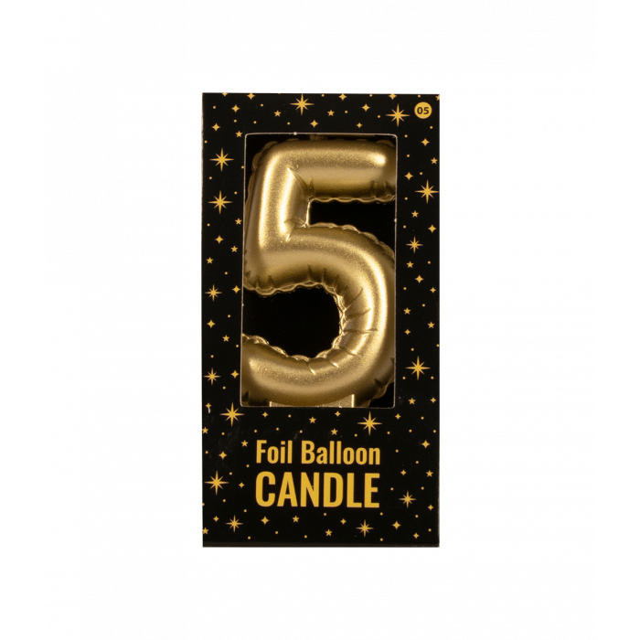 - Świeczka urodzinowa cyferka 5 na kształt balona foliowego, w kolorze złotym. Niezbędny element imprezy urodzinowej oraz jubileuszowej. Stanowi doskonały pomysł na dekoracje tortów!