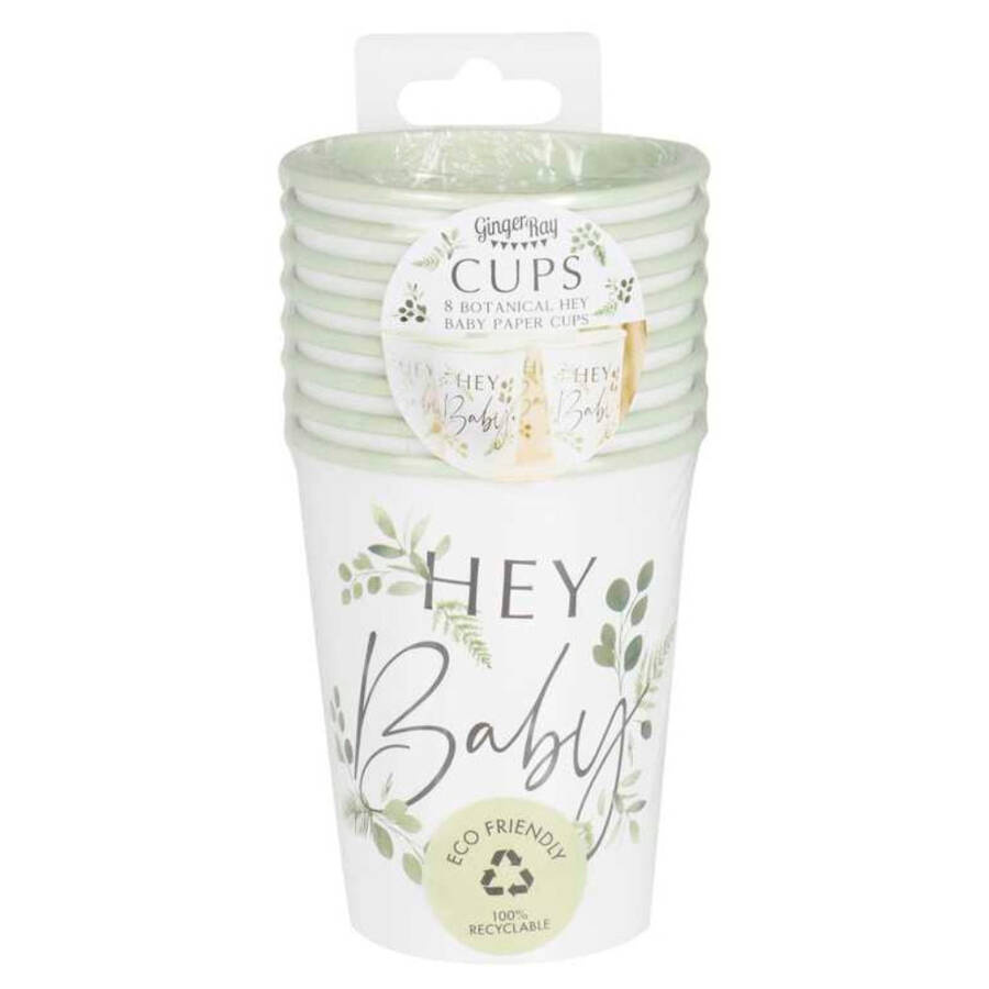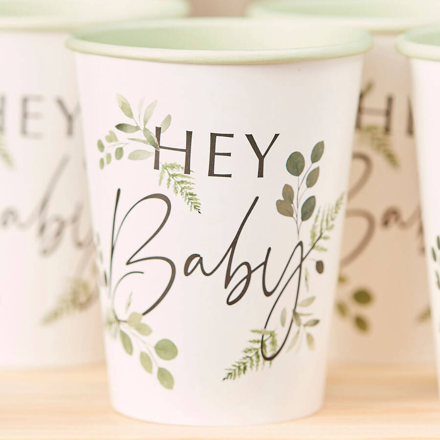 Kubki papierowe "Hey Baby" z serii Botanical to urocze i praktyczne naczynia, idealne do serwowania napojów podczas imprezy Baby Shower lub narodzin maluszka.
