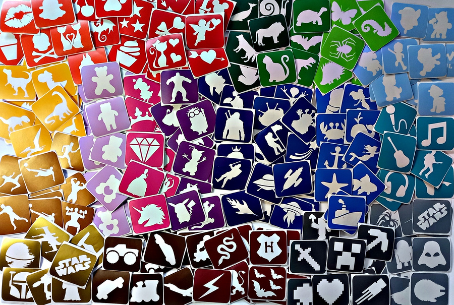 - Zestaw zawiera 20 sztuk szablonów do tatuaży brokatowych o zbliżonej tematyce. W zestawie znajdziesz wszystkie wzory pokazane na zdjęciu głównym. Wymiar 1 szablonu ok. 5,8 x 5,2 cm. Cena za zestaw.
