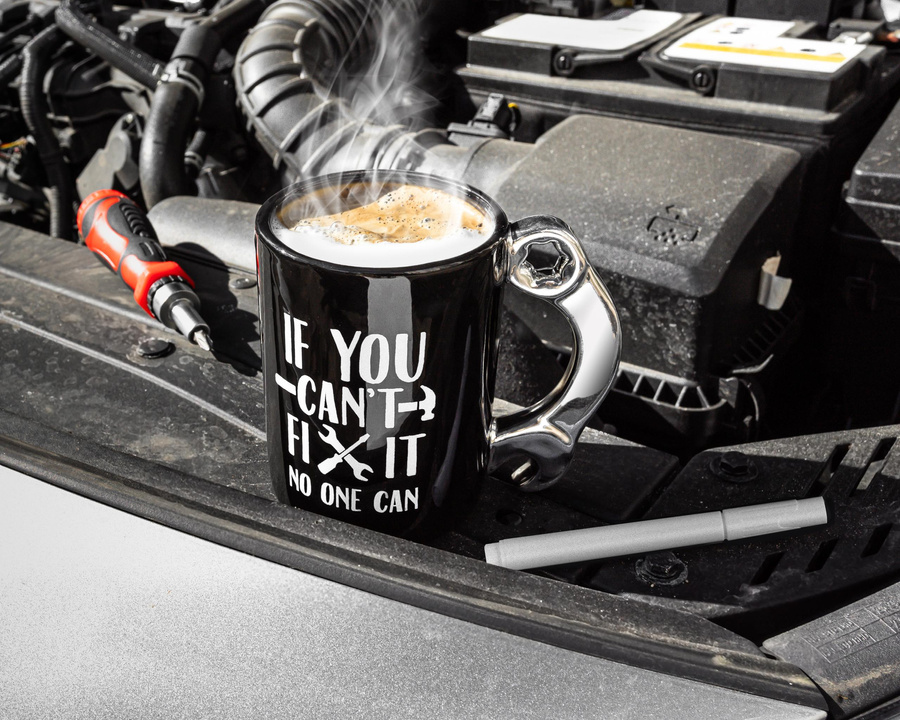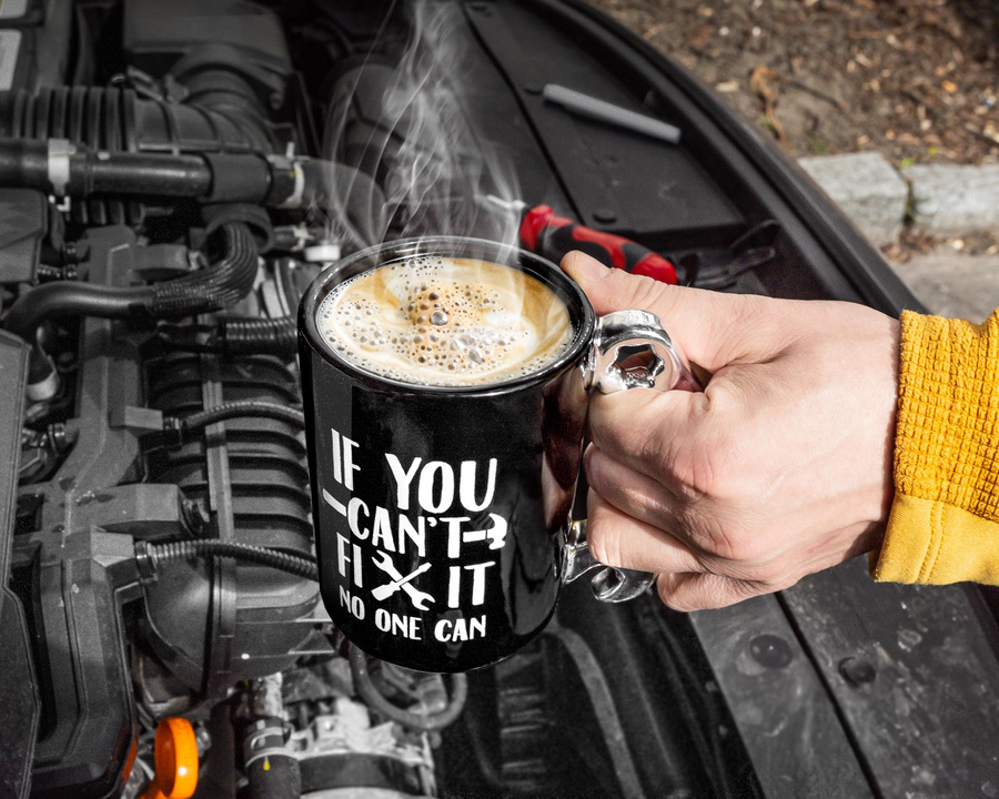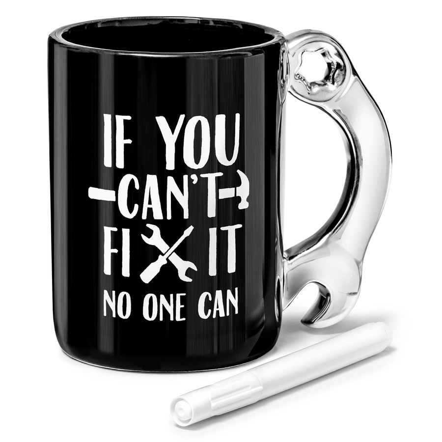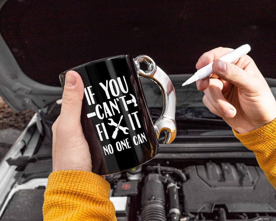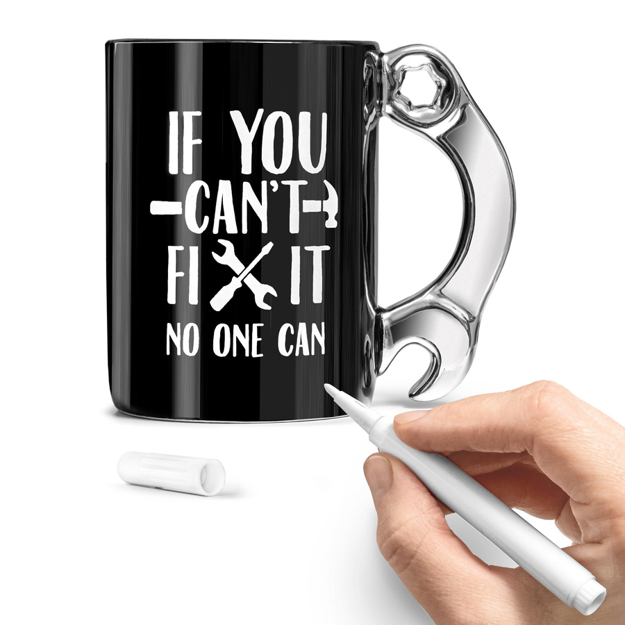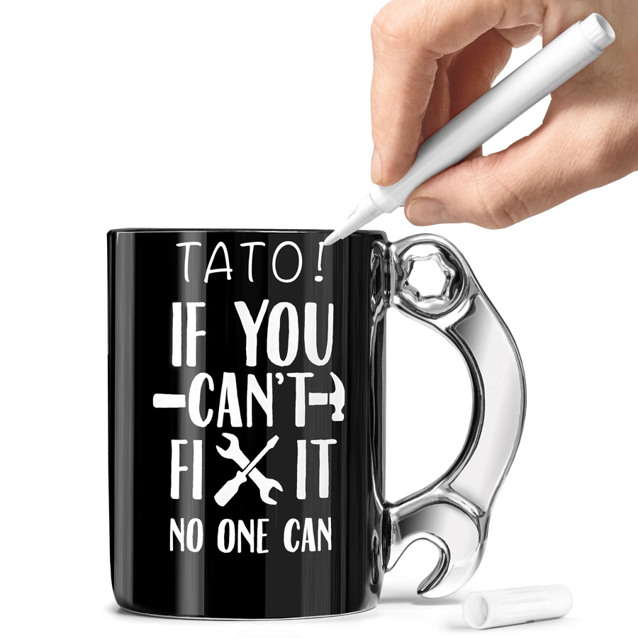 W końcu Twój bohater domu doczekał się swojego kubka :) Dodatkowo możesz opatrzyć ten kubek swoim indywidualnym napisem czy nawet rysunkiem, bo w zestawie znajdziesz biały marker suchościeralny. Na kubku nadrukowaliśmy tekst w języku angielskim, żeby kubek miał jak największy zasięg, który jest wyrazem uznania dla każdego domowego ogarniacza, zwanego kiedyś złota rączką ;) "IF YOU CAN'T FIX IT NO ONE CAN" czyli Jeśli Ty tego nie naprawisz, to nikt nie ogranie :) Nad tym napisem lub pod nim możesz napisać np. "DZIADEK JÓZEK", "TATO" czy po prostu imię Twojego bohatera, a z drugiej strony można namalować choćby serduszko czy kwiatka lub również umieścić już trochę dłuższy tekst. Tak spersonalizowany kubek bez wątpienia podbije serce obdarowanej osoby. Daj jej do zrozumienia, że widzi się jej zaangażowanie i umiejętności, a co najważniejsze docenia się je i jest sie za nie wdzięcznym. Flamaster jest suchościeralny więc co jakiś czas warto odnowić napis lub zmienić np. treść dedykacji czy opatrzyć go innym rysunkiem