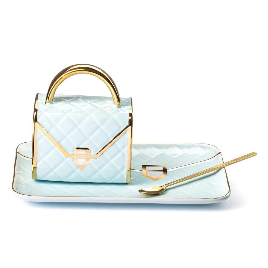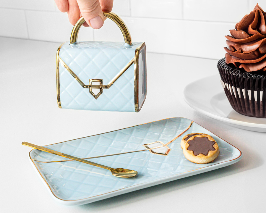 - gustowny zestaw kobiecy: kubek damska torebka z podstawką i złotą łyżeczką