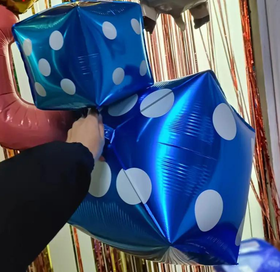 - Balon foliowy w kształcie kostki do gry w kolorze niebieskim.