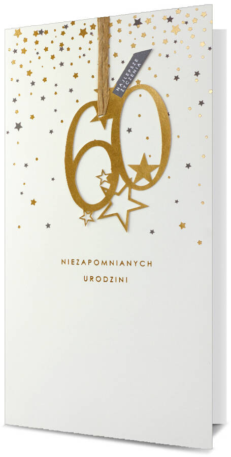 - Kartka urodzinowa z okazji 60 urodzin ze złotym nadrukiem oraz dedykacją umieszczoną w środku.