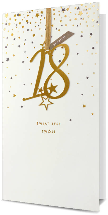 - Kartka urodzinowa z okazji 18 urodzin ze złotym nadrukiem oraz dedykacją umieszczoną w środku.