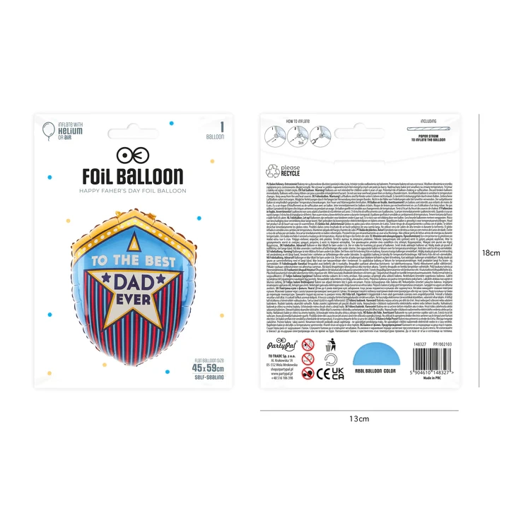 - Kolorowy balon foliowy w kształcie odznaki, z napisem The Best Dad Ever