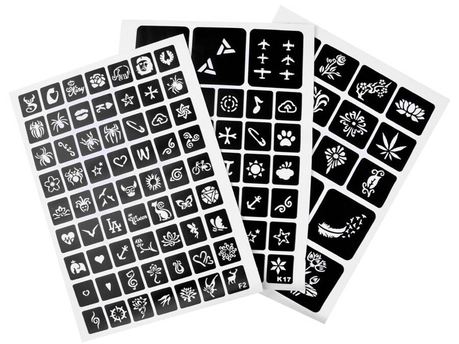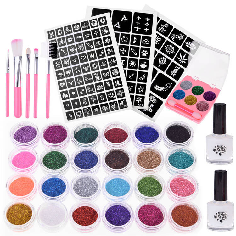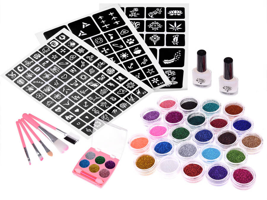 Duży zestaw do tatuaży brokatowych (szablony, pędzle, klej, brokaty)