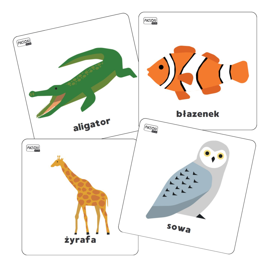 - Karty przedstawiają 78 zwierząt, wraz z ich polskimi nazwami, występującymi na całym świecie.