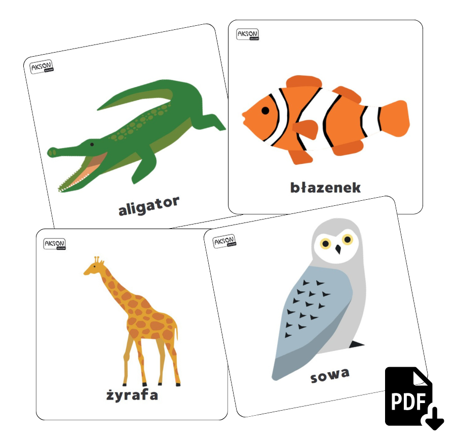 Zestaw zawiera 78 gotowych do wydruku kart. Na kartach znajdziesz kolorowe zwierzęta z całego świata, wraz z ich nazwami po polsku.