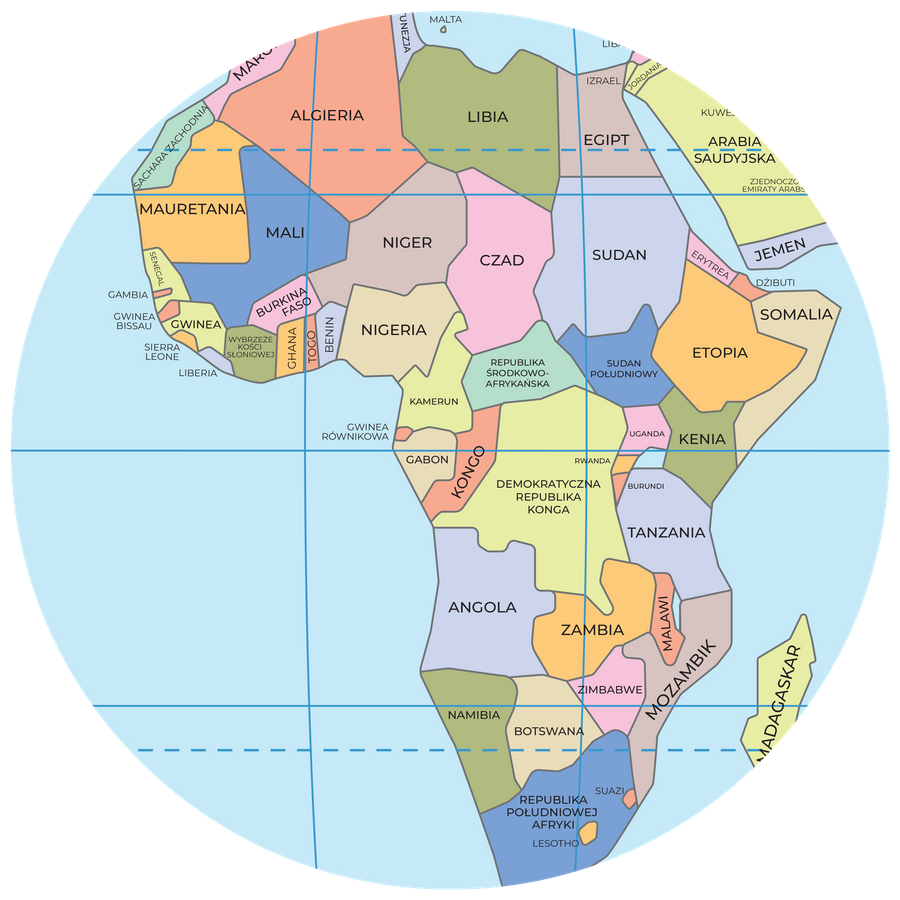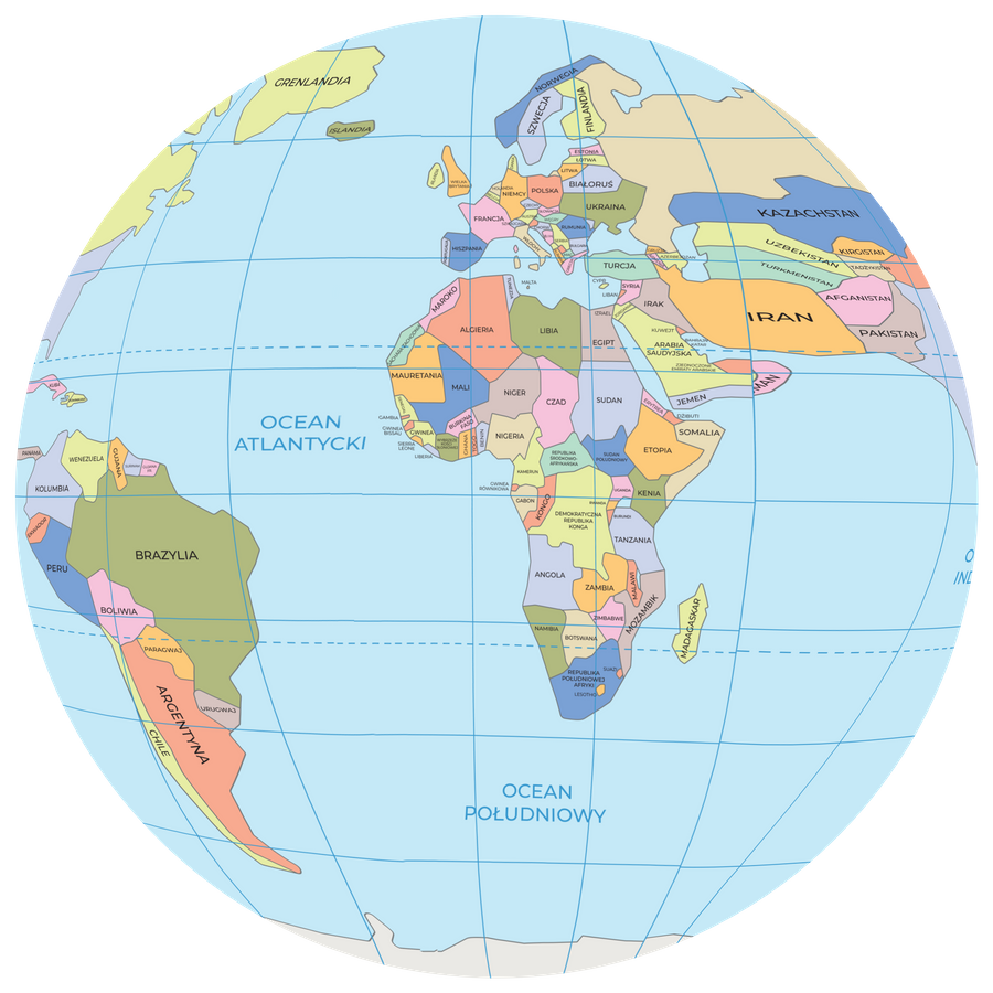 Jedyna taka, niepowtarzalna piłka globus z zaznaczonymi państwami świata oraz ich nazwami w języku polskim.