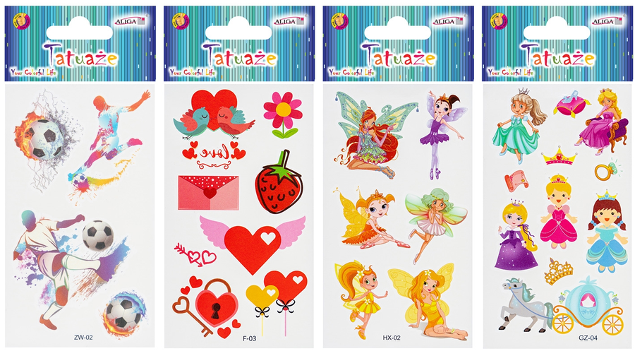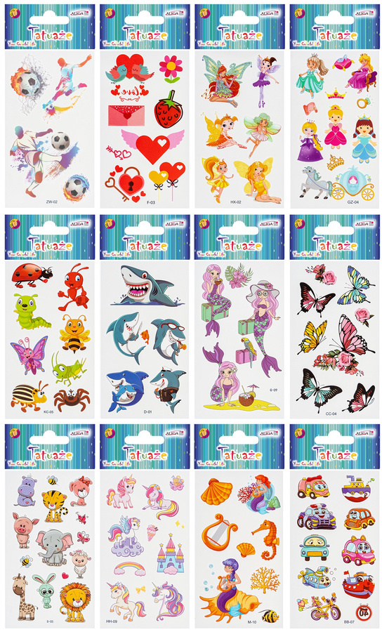 Odkryj świat fantazji i zabawy dzięki naszym tatuażom zmywalnym dla dzieci! Ten kolorowy arkusz pełen jest różnorodnych wzorów, które z pewnością oczarują każde dziecko. Idealne na przyjęcia, zabawy w domu, czy jako wyjątkowy dodatek do codziennych stylizacji.
