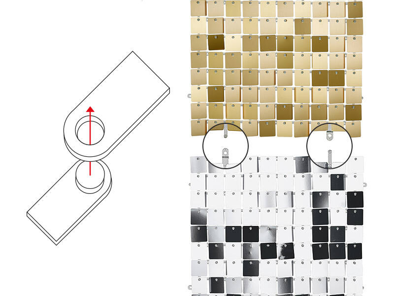 Panele cekinowe posiadają zatrzaski na bokach, które umożliwiają łączenie paneli kwadratowych w spójną całość – patrz instrukcja na karcie produktu. Połączone panele idealnie pasują na stojak 150x200 cm, które można zamontować używając żyłki. Panele tworzą niesamowity efekt dzięki blaszkom, które ruszają się wskutek ruchu powietrza.