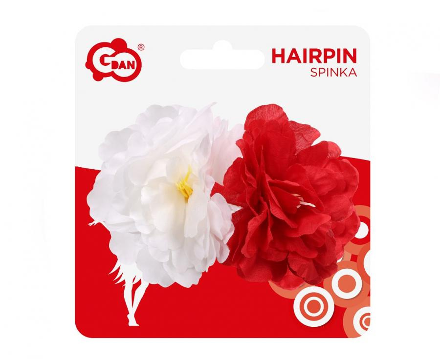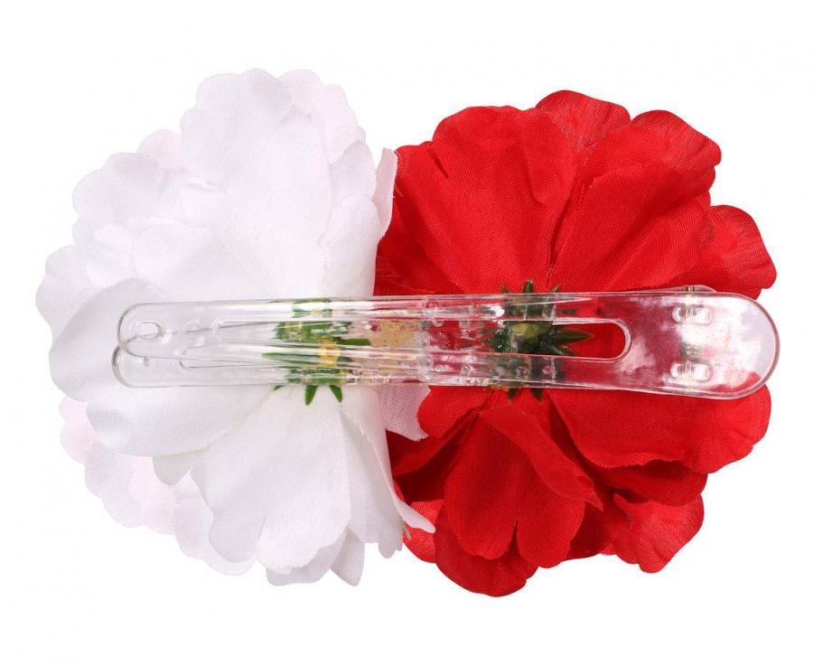 • Spinka do włosów z 2 dużymi biało czerwonymi kwiatami.