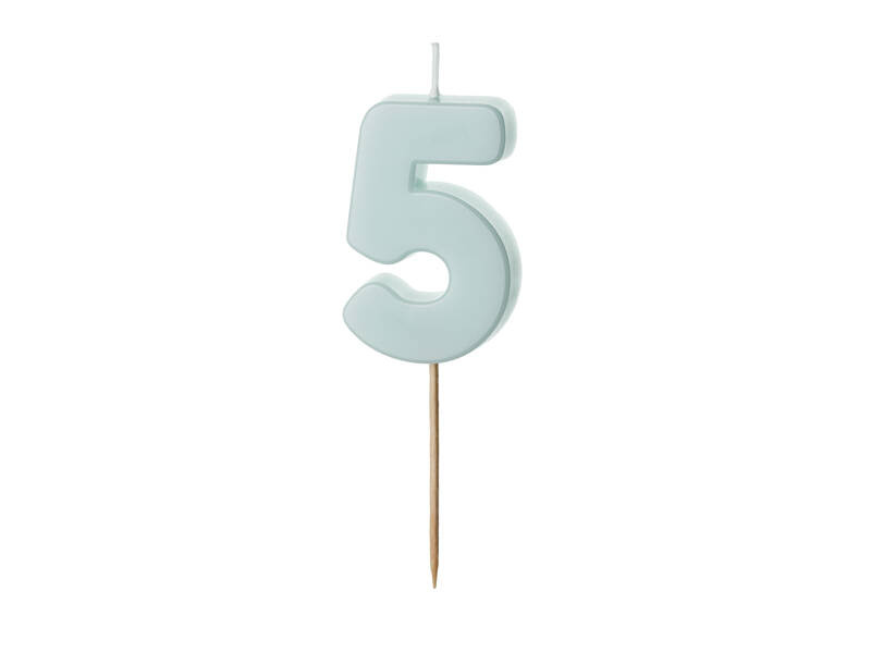 - Świeczka urodzinowa cyferka 5 w kolorze jasno niebieskim.