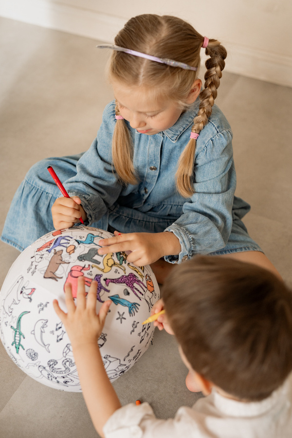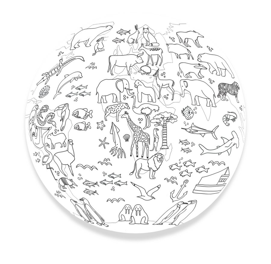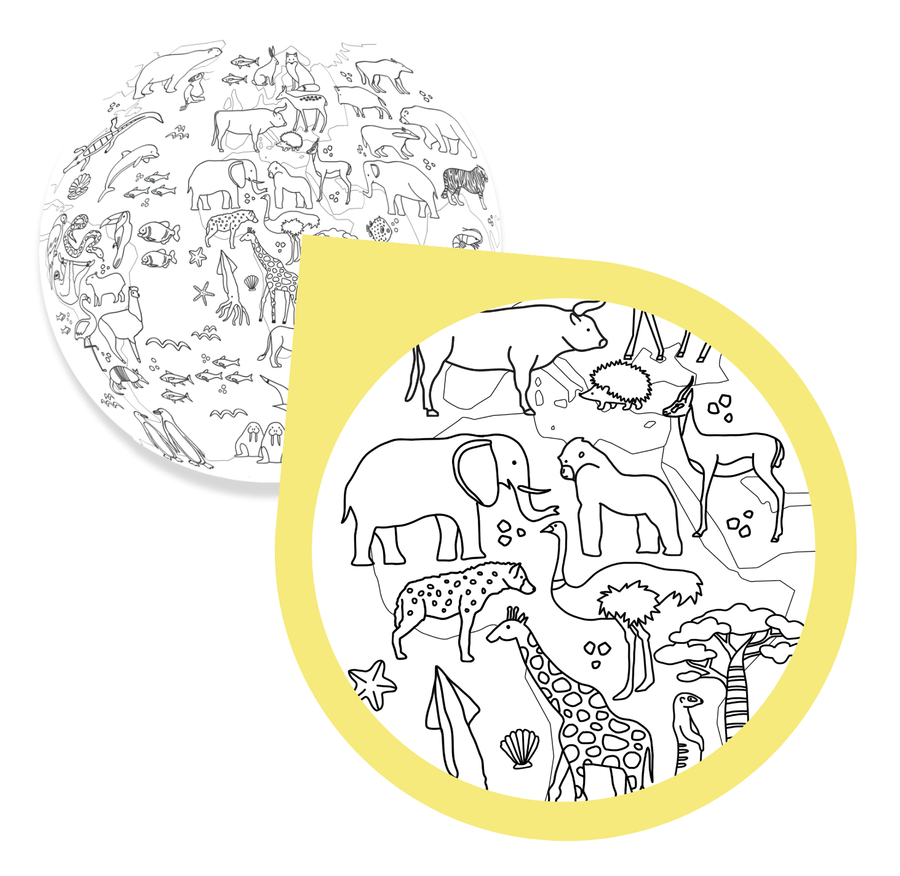 - Piłka balonowa Akson do zabaw animacyjnych i sportowo-rekreacyjnych, w kształcie globusa i nadrukowanymi kontynentami i zwierzętami do kolorowania.