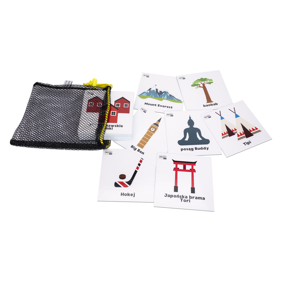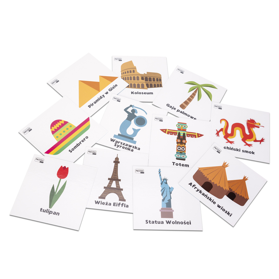 - Zestaw 52 karty z kolorowym nadrukiem zabytków z całego świata i ich nazwami po polsku.