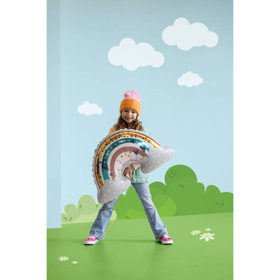 - Balon przedstawia klasyczną tęczę w jasnych pastelowych odcieniach, które przyciągną wzrok i ożywią każde wnętrze.