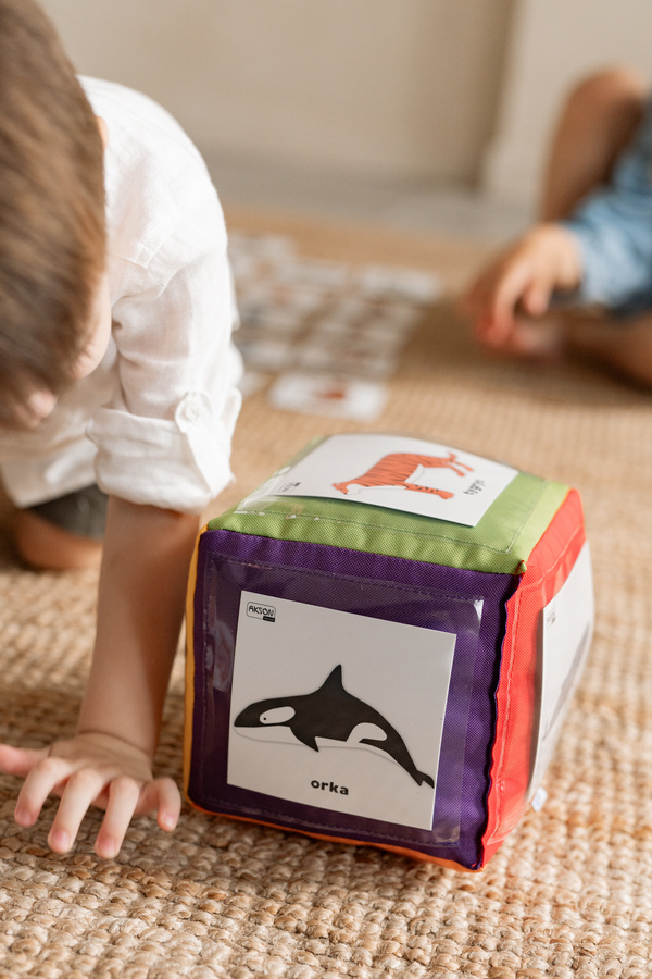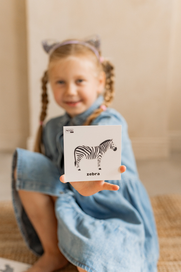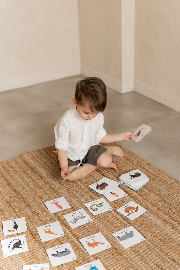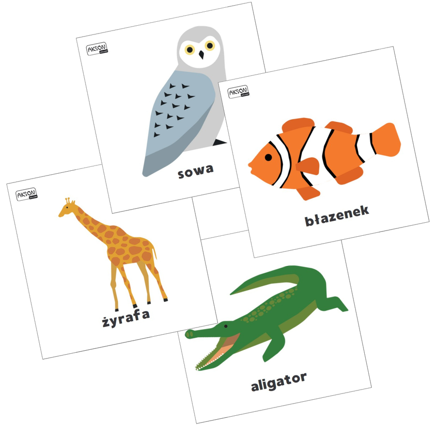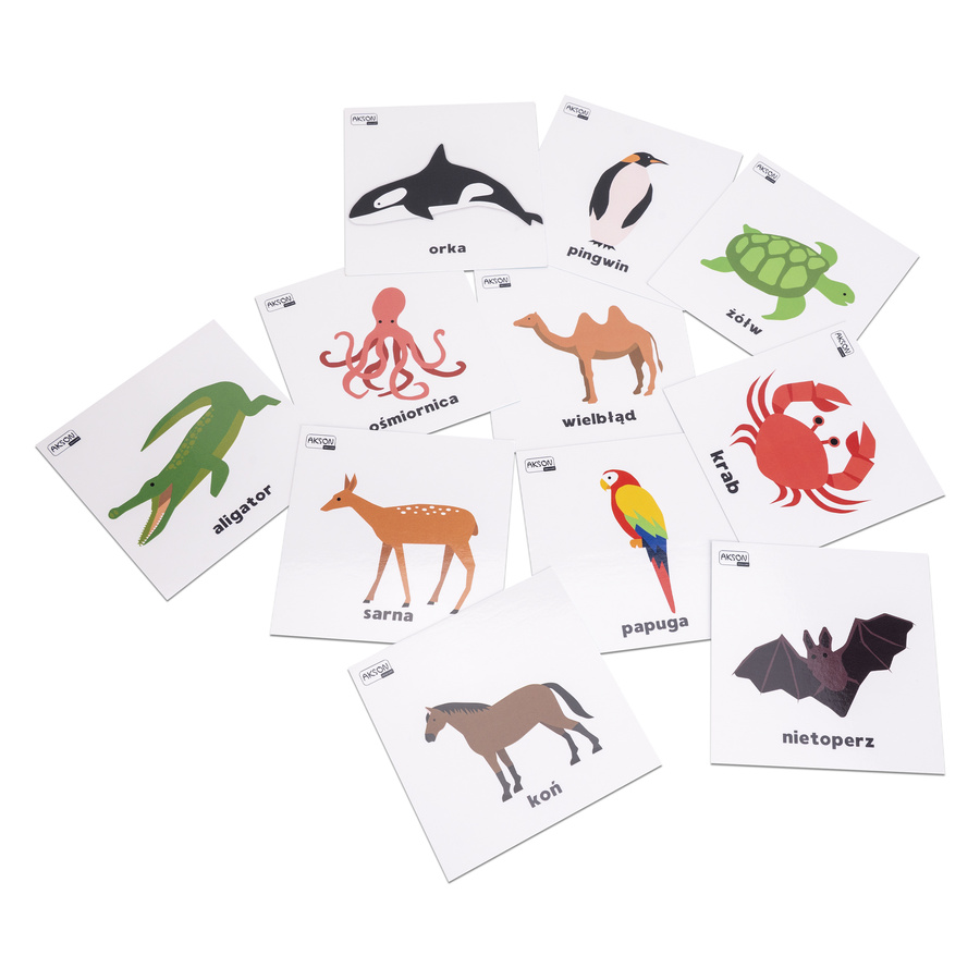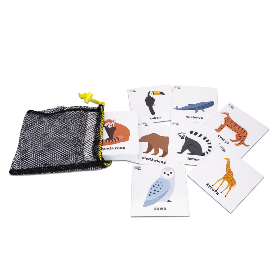 - Zestaw 78 kart z kolorowym nadrukiem zwierząt i ich nazw.