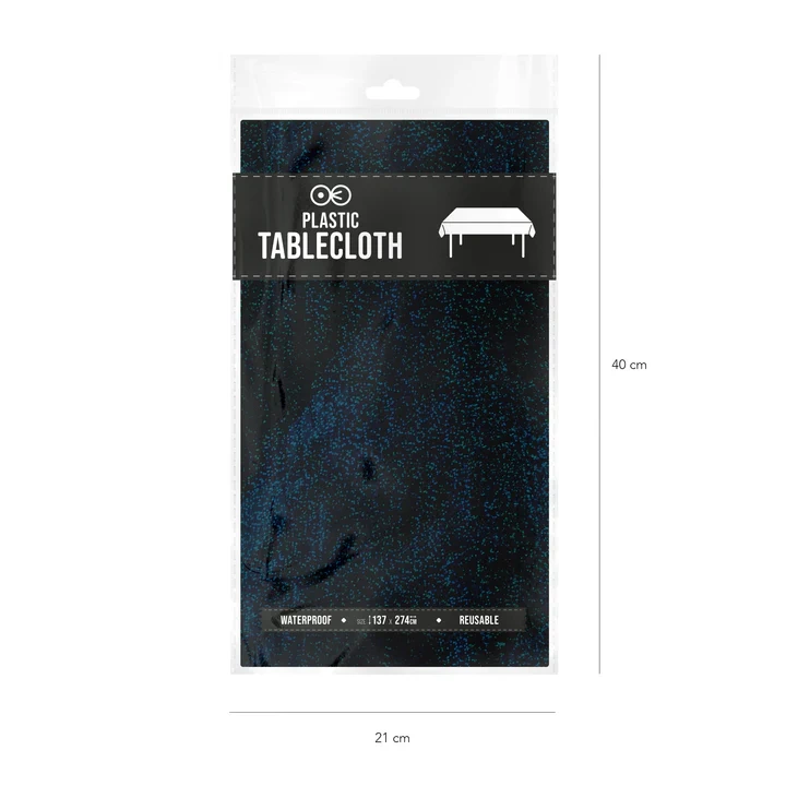 • Obrus foliowy holograficzny dwustronny w kolorze czarnym i srebrnym.