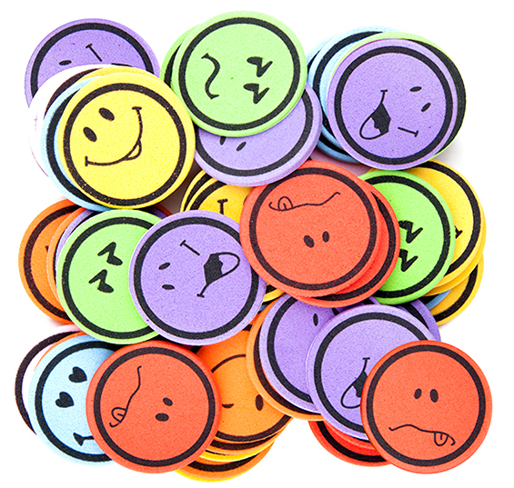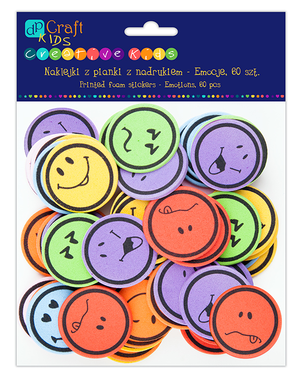 • Okrągłe naklejki z pianki z motywami różnych stanów emocjonalnych, w kilku kolorach. Świetnie nadają się do wszelkiego rodzaju dziecięcej aktywności twórczej. Cena za opakowanie 60 sztuk - mix wzorów.