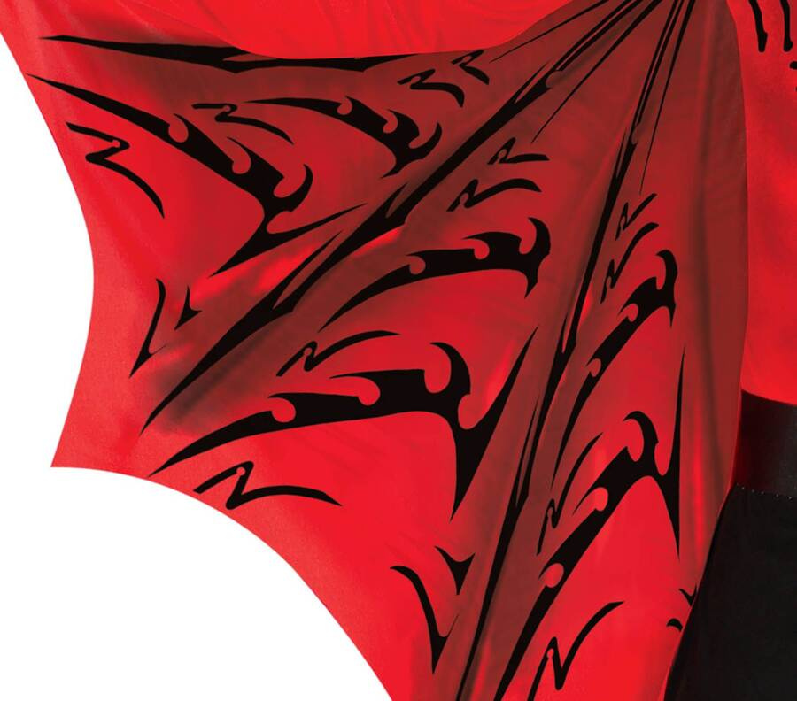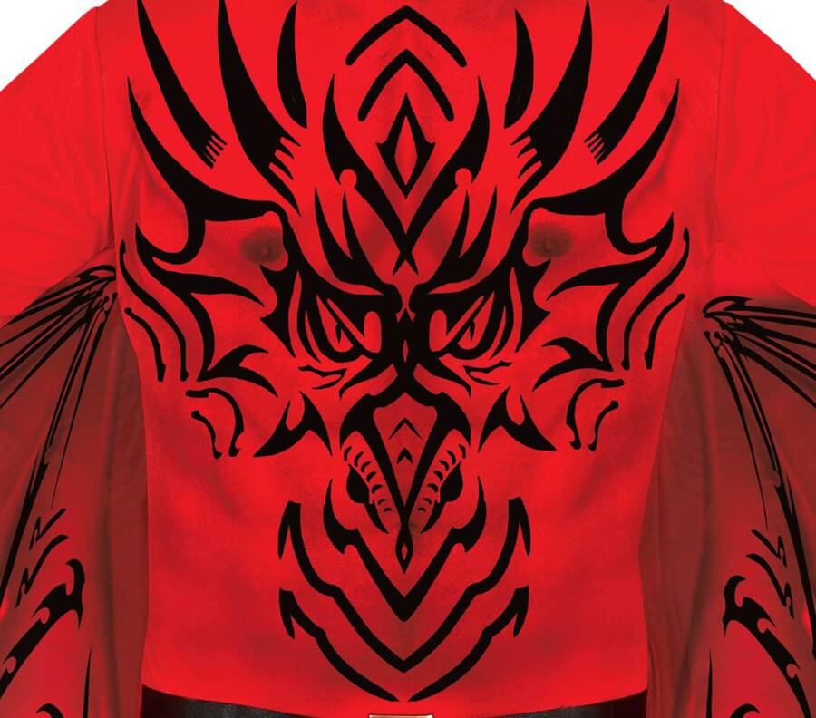 Kostium składa się z jednoczęściowego kombinezonu zapinanego w tyle na zamek oraz czarnego paska. Czerwona góra kostiumu z przyszytymi do rękawów skrzydłami oraz kapturem z rogami wraz z czarnym szerokim dołem i paskiem z klamrą tworzą mroczne halloweenowe przebranie rodem z piekieł.