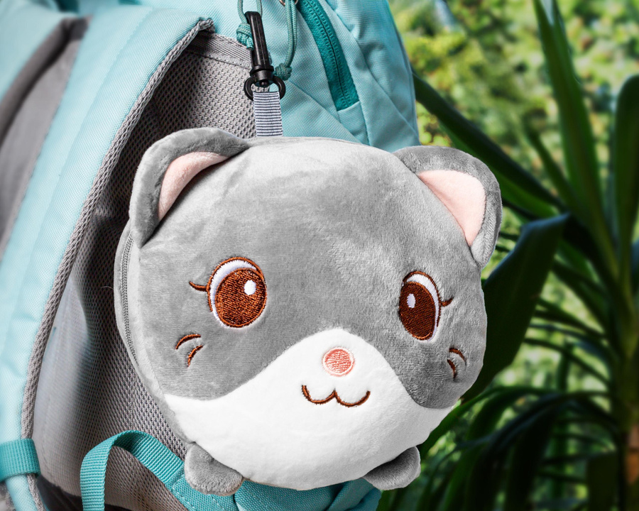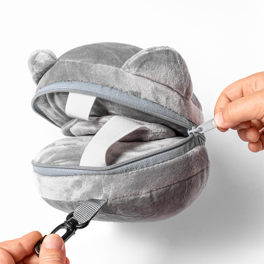 Przedstawiamy uroczą i funkcjonalną poduszkę podróżną z maską na oczy, idealną dla dzieci. Poduszka zaprojektowana w kształcie szarego kotka nie tylko zapewni komfort w czasie podróży, ale także stanie się ulubionym towarzyszem maluchów. Dzięki niej Twoje dziecko będzie mogło odpocząć i zrelaksować się, co uczyni każdą wyprawę bardziej komfortową. Zapinana na zamek poduszkę po złożeniu można za pomocą zawieszki przymocować do plecaka lub paska