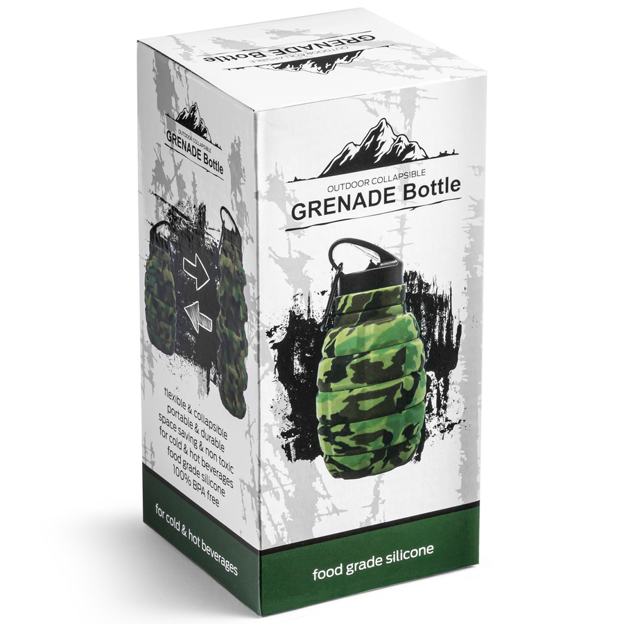 • Wyjątkowa składana butelka, który łączy fajny i niebanalny design z niesamowitą funkcjonalnością! Nasz model w kształcie granatu i w kamuflażowym wzorze jest nie tylko estetyczny i przyjemny dla oka, ale również niezwykle praktyczny.