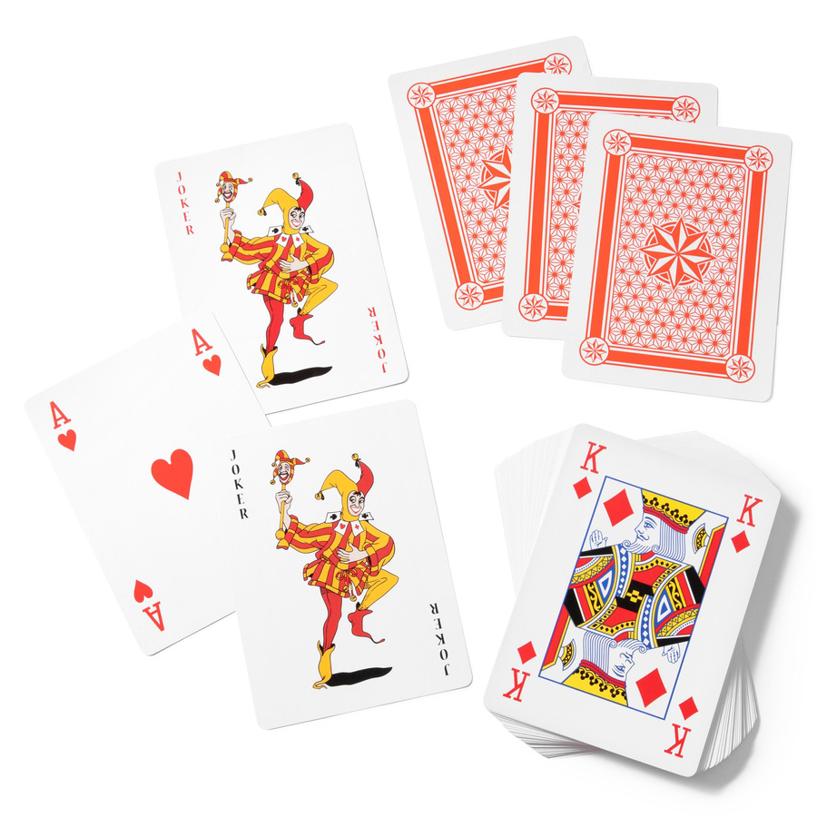 Karty do gry o grubo powiększonym rozmiarze, bo w końcu rozmiar także tutaj ma znaczenie ;) i to duże. Gra w karty taką talią to duuuża dawka dodatkowej zabawy. Zbędne stają się okulary i przyglądanie się kartom z bliska, wszystko jest dobrze widoczne i to ze sporej odległości. Nie można też oszukiwać, taki as w rozmiarze XXL nie zmieści się siłą rzeczy do rękawa. Karty zabezpieczone specjalną powłoką z tworzywa sztucznego, by były sztywniejsze i wygodne do gry, a przy okazji trwalsze.