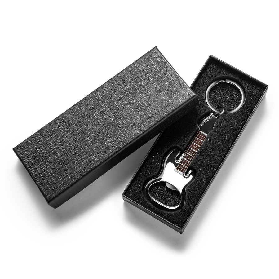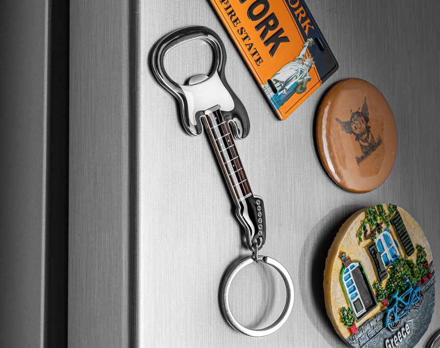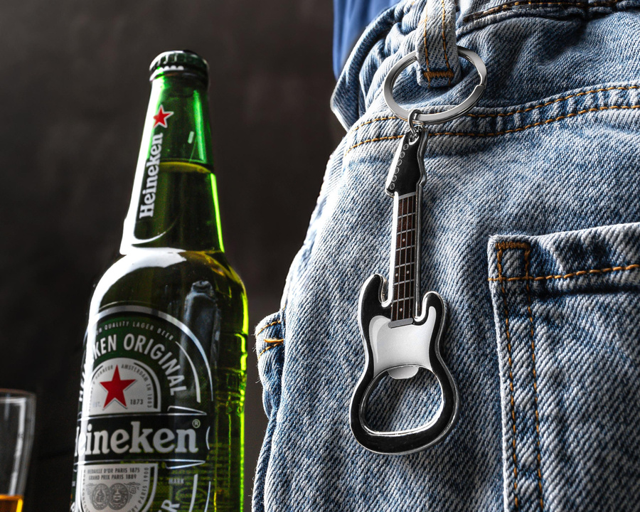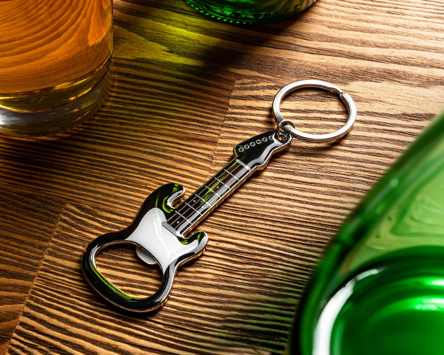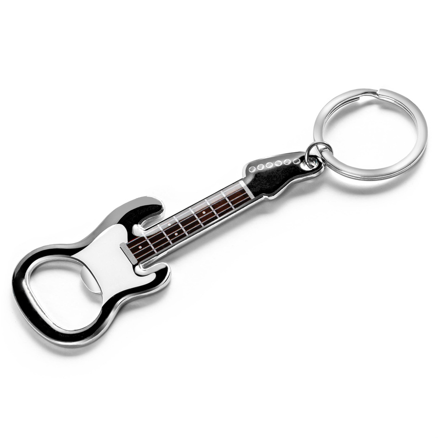 Otwieracz do butelek w kształcie gitary elektrycznej z kółkiem na klucze i magnesem dla wszystkich fanów różnych przyjemnych dla ucha dźwięków, w tym dźwięku otwierania butelki z ulubionym napojem :)