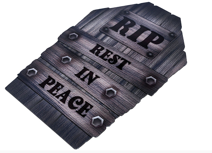 - Dekoracja halloweenowa w kształcie nagrobka z napisem Rest in Peace.