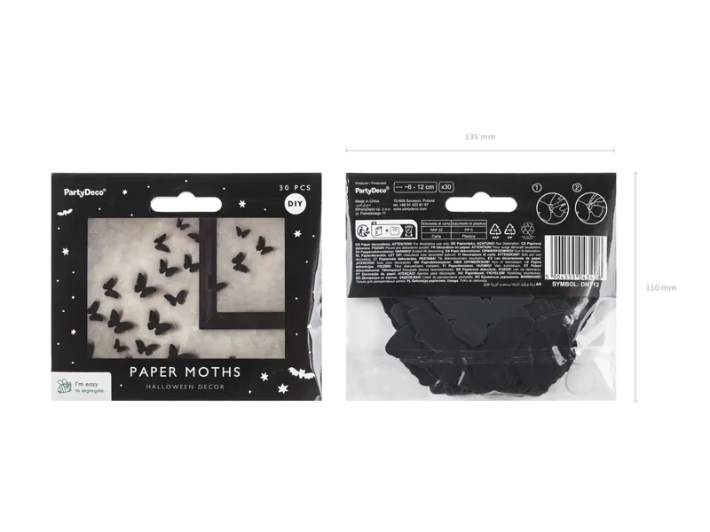 Dekoracja papierowa czarne ćmy to elegancki zestaw stylowych ozdób wykonanych z wysokiej jakości papieru, przeznaczony do dekoracji wnętrz. Zestaw zawiera 30 sztuk czarnych ciem o różnej wielkości, od 6 cm do 12 cm, co pozwala na stworzenie interesującej i dynamicznej kompozycji na ścianach lub innych powierzchniach.