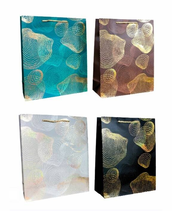 Przedstawiamy naszą wyjątkową torebkę prezentową z delikatnymi złotymi, abstrakcyjnymi zdobieniami, w 4 kolorach do wyboru.