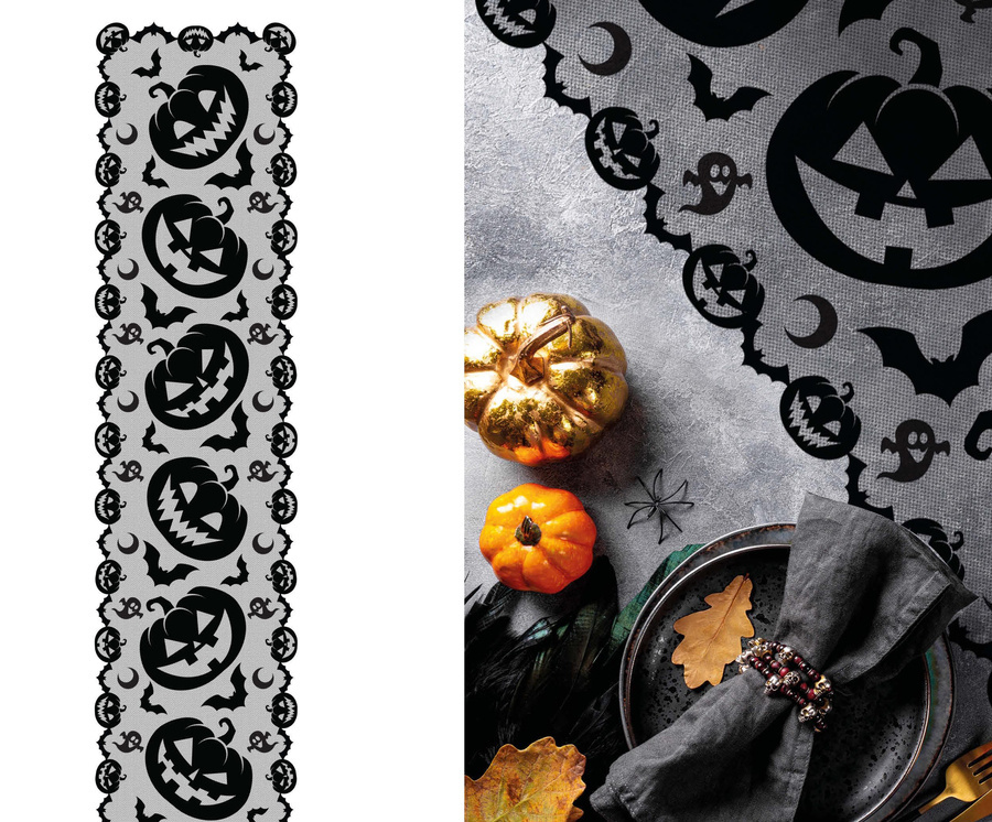 - Czarny, ażurowy bieżnik w dynie i nietoperze doskonale uzupełni halloweenową dekorację stołu.