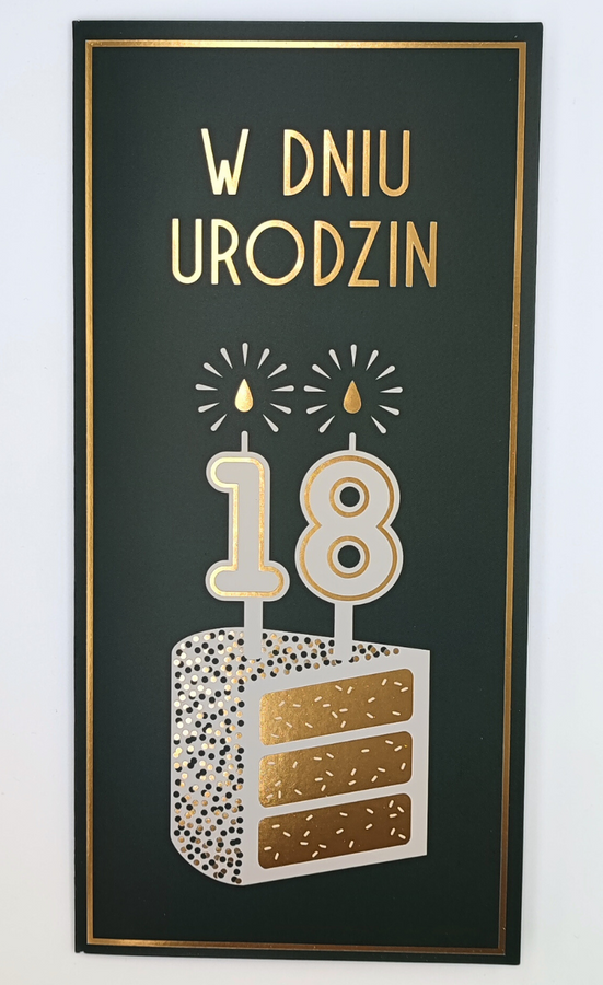 Wyjątkowa kartka okolicznościowa zaprojektowana specjalnie na 18-ste urodziny – symboliczny moment wejścia w dorosłość! Kartka wyróżnia się eleganckim ciemnozielonym tłem, które nadaje jej wyrafinowanego charakteru, oraz efektownym motywem urodzinowego tortu. Złote i kolorowe akcenty tortu oraz świeczek sprawiają, że całość prezentuje się wyjątkowo radośnie i uroczyście.