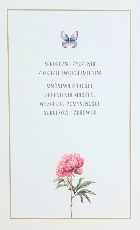 Ta elegancka kartka imieninowa to idealny sposób, by wyrazić pamięć i serdeczne życzenia, doskonała zarówno dla kobiet, jak i mężczyzn.
