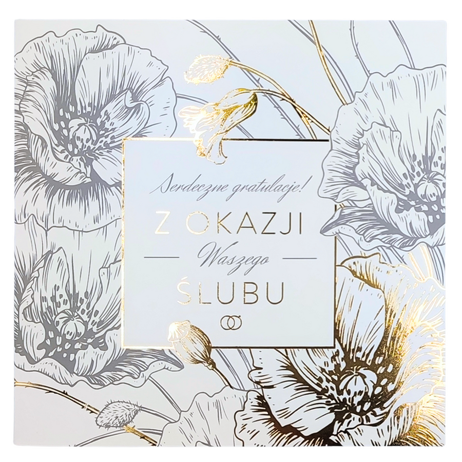 Elegancka kartka okolicznościowa zaprojektowana specjalnie na ślub, ozdobiona subtelnym, kwiatowym wzorem w srebrno-złotej kolorystyce. Kwadratowy format dodaje jej nowoczesnego i stylowego charakteru, a połyskujące akcenty w kolorach złota nadają kartce wyrafinowania, idealnie wpisując się w uroczysty nastrój ślubu.