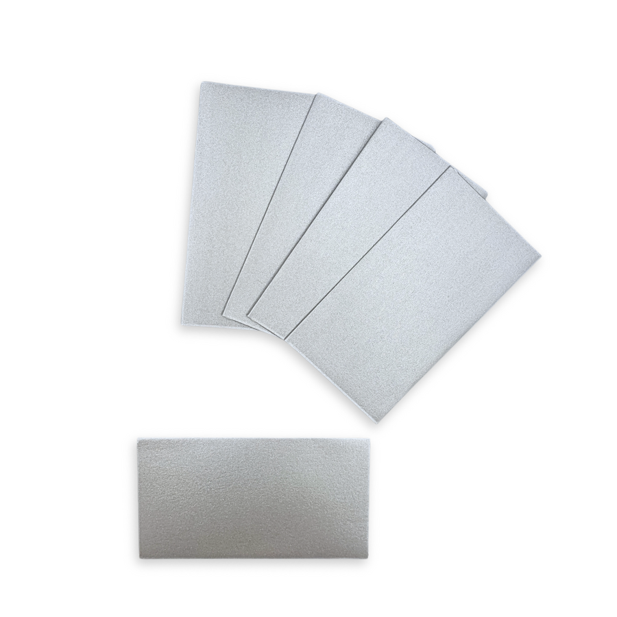 Elegancka mini koperta o wymiarach 11,5 x 6 cm, wykonana z wysokiej jakości papieru w kolorze srebrnym o perłowym wykończeniu.