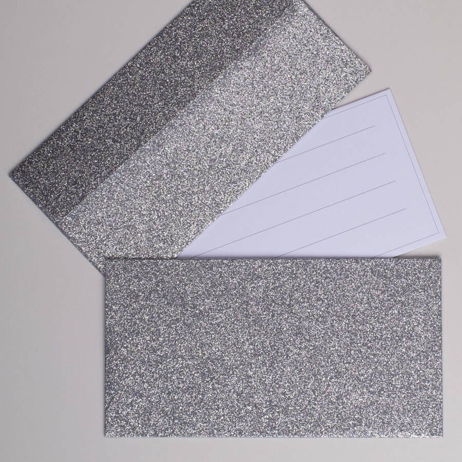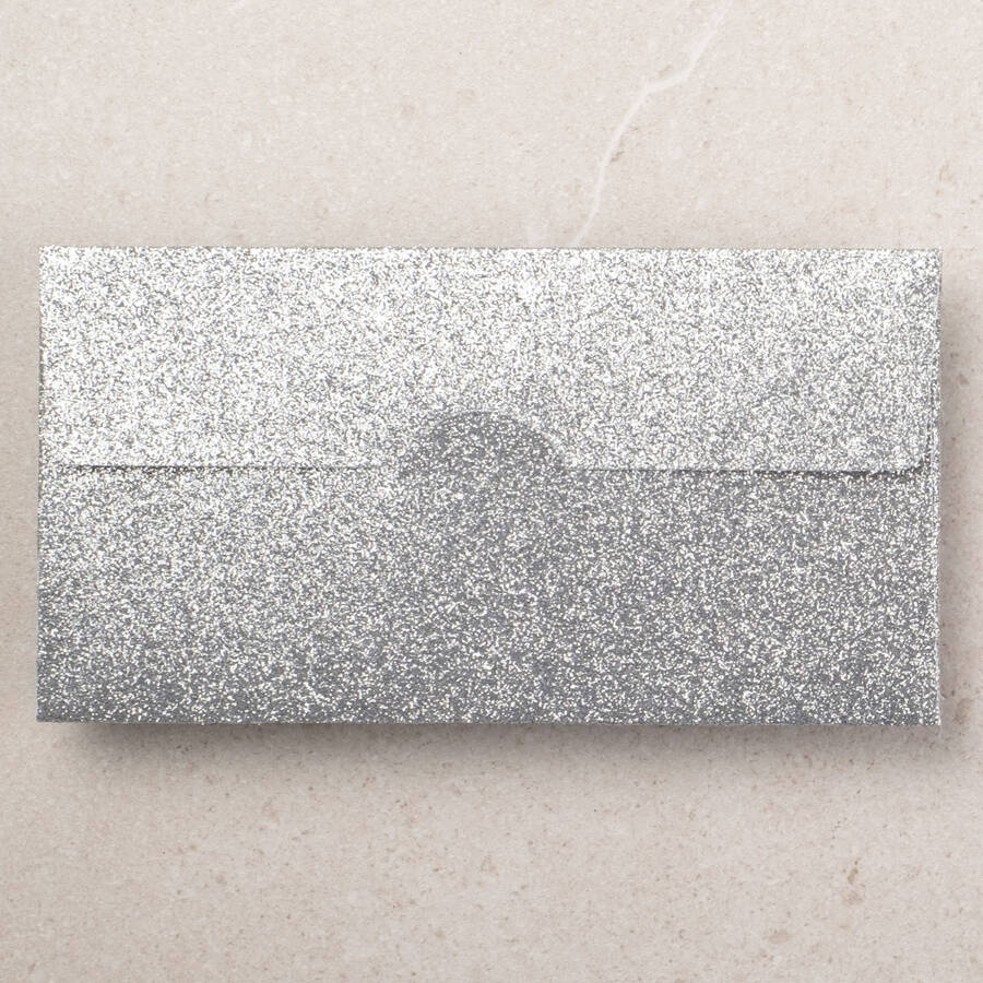 Elegancka koperta podarunkowa o wymiarach 17x9 cm, wykonana z srebrnego papieru pokrytego efektownym brokatowym wykończeniem.
