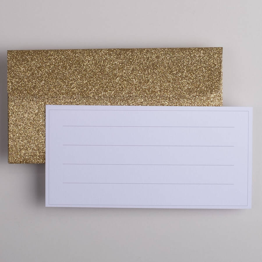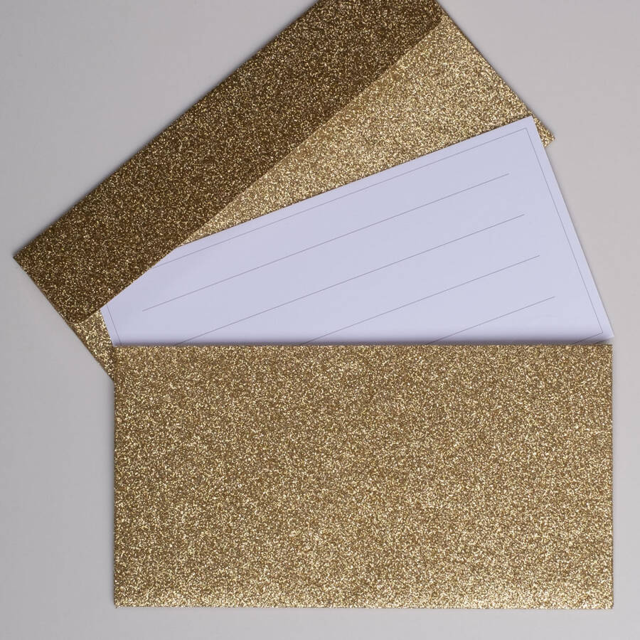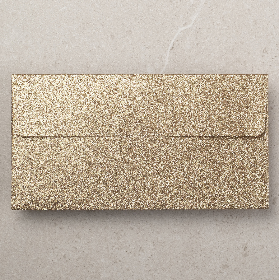 Elegancka koperta podarunkowa o wymiarach 17x9 cm, wykonana z papieru o odcieniu złotego różu, pokrytego efektownym brokatowym wykończeniem.