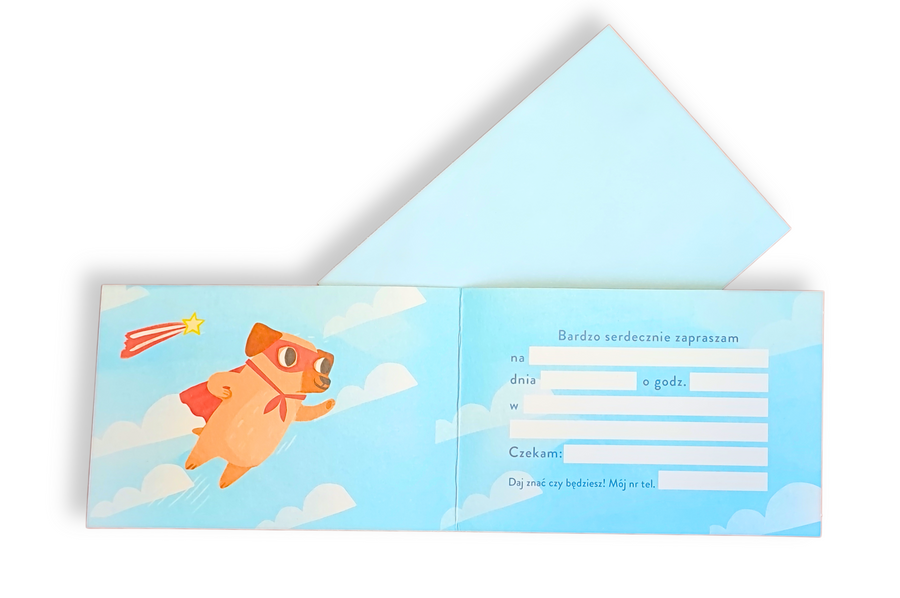 Zaproszenie na urodziny z odważnym pieskiem superbohaterem to fantastyczny sposób na zaproszenie dzieci na wyjątkową, pełną przygód imprezę! Na okładce widnieje uroczy piesek w pelerynie superbohatera, gotowy do akcji, co z pewnością zachwyci małych fanów supermocy.