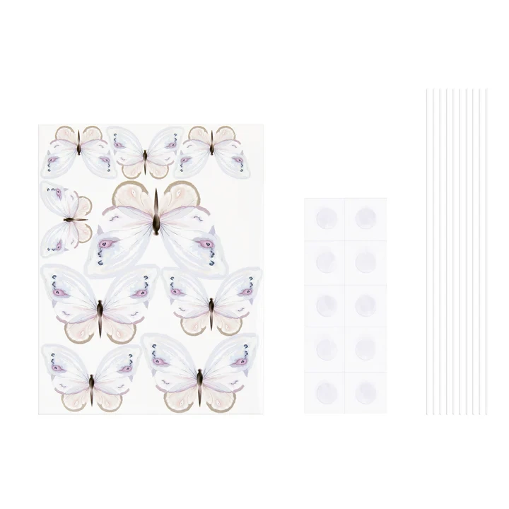 - W zestawie: 9 szt. papierowych motylków różnej wielkości, 9 szt. elastycznych pikerów, 9 szt. kropek klejowych