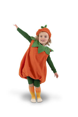 Tunika w klasycznym pomarańczowym kolorze, ozdobiona zielonym kołnierzykiem przypominającym liście dyni oraz czapeczka z zielonym ogonkiem.