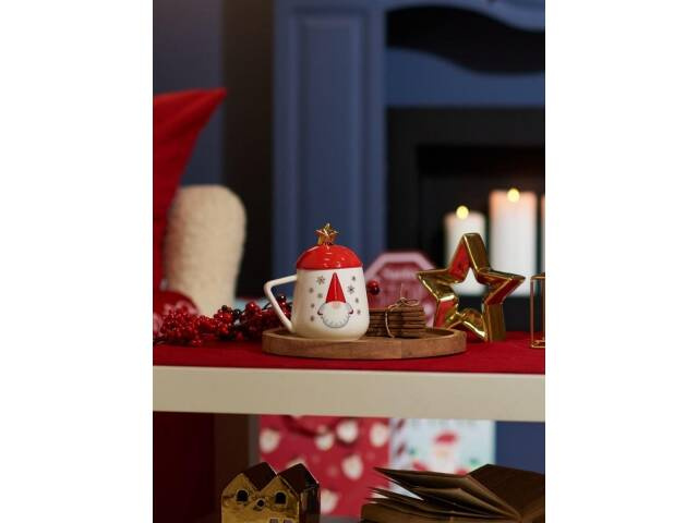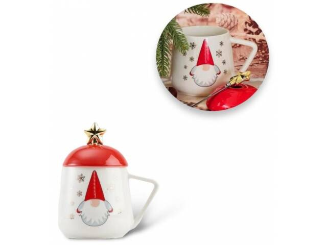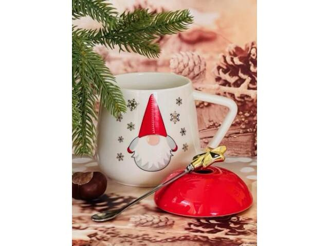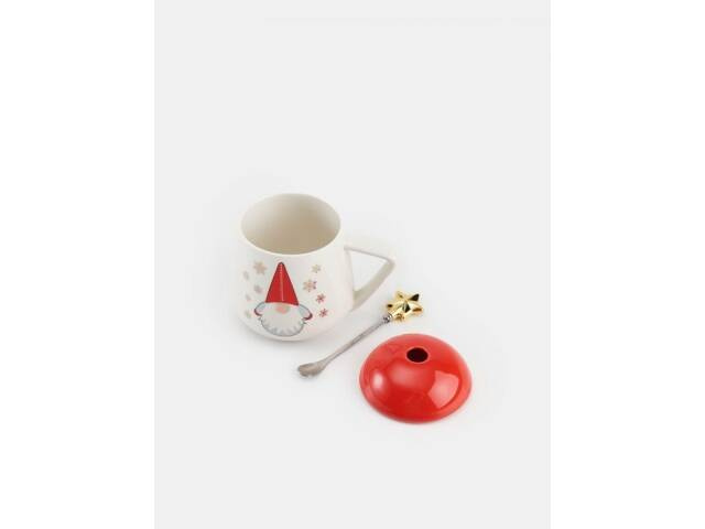 Kubek świąteczny z przykrywką i łyżeczką biało czerwony