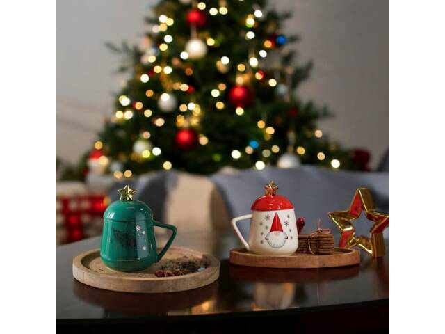 Uroczy kubek ze świątecznej kolekcji idealnie wpisze się w klimat świąt. Kubek z gałązką choinki i gwiazdkami sprawia, że mocno kojarzy się ze Świętami Bożego Narodzenia. Wzór gałazki i gwiazdek znajduje się po obu stronach kubka. Łyżeczka zakończona złotą gwiazdką.