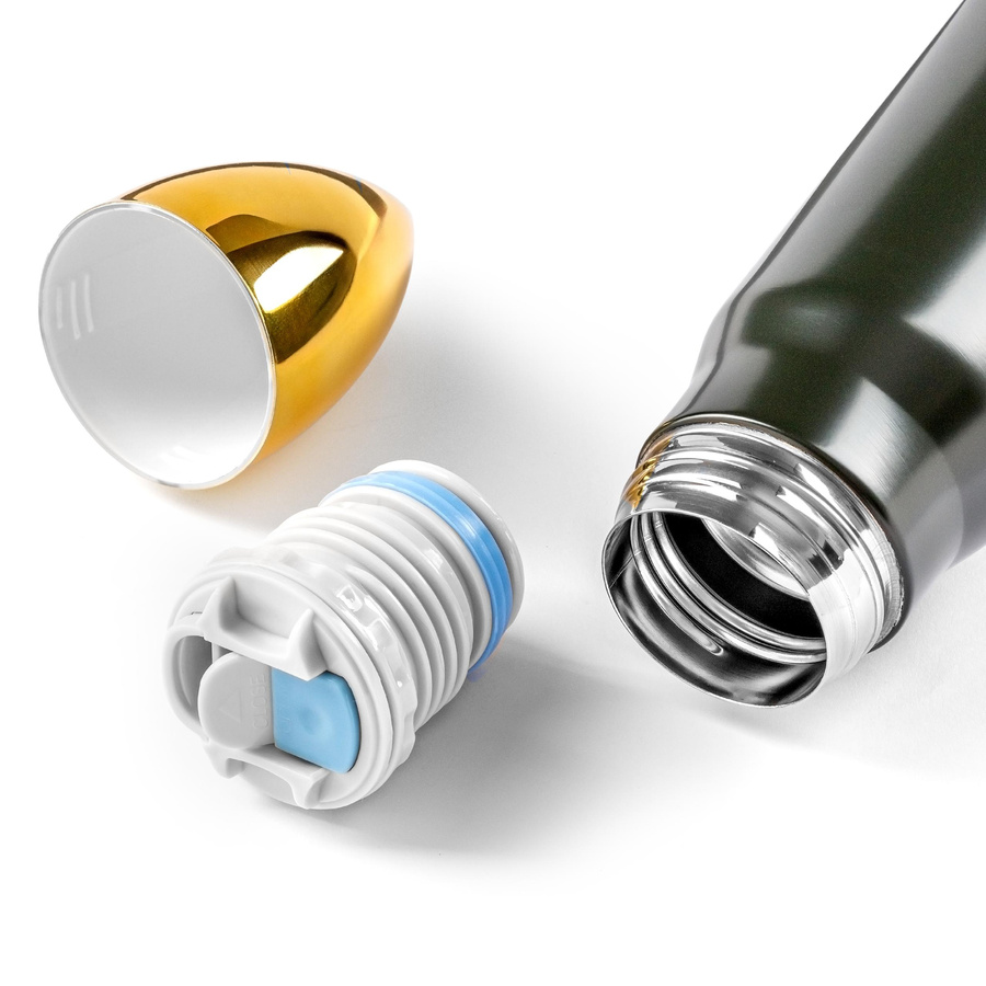 • szczelna zakrętka z silikonową uszczelką i przyciskiem otwierającym do nalewania